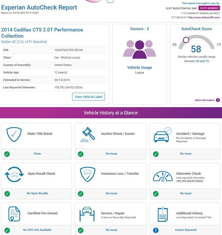 Recent Arrival! 2014 CTS Cadillac 2.0L Turbo Performance Black RavenThis is an As Is vehicle. As Is Vehicles receive limited reconditioning to help keep the price low to the public. These vehicles are sold AS IS with no express or implied warranty. Hurry in today for a test drive, as these cars sell quickly. Clift Buick GMC assumes no responsibility for any repairs regardless of any oral statements made about the vehicle. AWD.19/28 City/Highway MPGAt Clift, all of our Vehicles Undergo Reconditioning to Make Sure that You are Getting a Quality Vehicle that You Deserve. This Includes Oil Change, Wash, Detail, and More. - You can Now Shop 24/7 Right from Your Home with Shop Click Drive. Pick up your Vehicle, Create your Deal, and Schedule your Delivery - Low Credit, Bad Credit, or No Credit to Buy a Vehicle? At Clift we Believe Everyone Deserves to purchase a vehicle, so We Offer Guaranteed Financing for Everyone. - We are a One Price Dealer! This means that we Keep our Prices as Low as Possible to Compete with other Dealerships. At Clift, you will find the Lowest Prices Possible. - We offer Free Delivery of your Newly Purchased Vehicle up to 25 Miles from our Dealership in Adrian, Michigan!Awards:* Car and Driver 10 Best Cars * Motor Trend Car of the YearCar and Driver, January 2017.