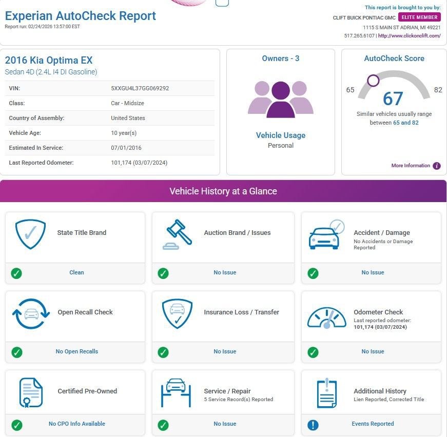 Recent Arrival! 2016 Optima Kia EX Silky SilverBlack w/Leather Seat Trim.24/35 City/Highway MPGAt Clift, all of our Vehicles Undergo Reconditioning to Make Sure that You are Getting a Quality Vehicle that You Deserve. This Includes Oil Change, Wash, Detail, and More. - You can Now Shop 24/7 Right from Your Home with Shop Click Drive. Pick up your Vehicle, Create your Deal, and Schedule your Delivery - Low Credit, Bad Credit, or No Credit to Buy a Vehicle? At Clift we Believe Everyone Deserves to purchase a vehicle, so We Offer Guaranteed Financing for Everyone. - We are a One Price Dealer! This means that we Keep our Prices as Low as Possible to Compete with other Dealerships. At Clift, you will find the Lowest Prices Possible. - We offer Free Delivery of your Newly Purchased Vehicle up to 25 Miles from our Dealership in Adrian, Michigan!Awards:* JD Power Automotive Performance, Execution and Layout (APEAL) Study * 2016 IIHS Top Safety Pick+ * 2016 KBB.com 16 Best Family Cars * 2016 KBB.com Best Buy Awards * 2016 KBB.com 10 Best Used Cars Under $20,000 * 2016 KBB.com 10 Most Comfortable Cars Under $30,000 * 2016 KBB.com Best Buy Awards Finalist * 2016 KBB.com 10 Best Sedans Under $25,000 * 2016 KBB.com 10 Most Awarded Cars