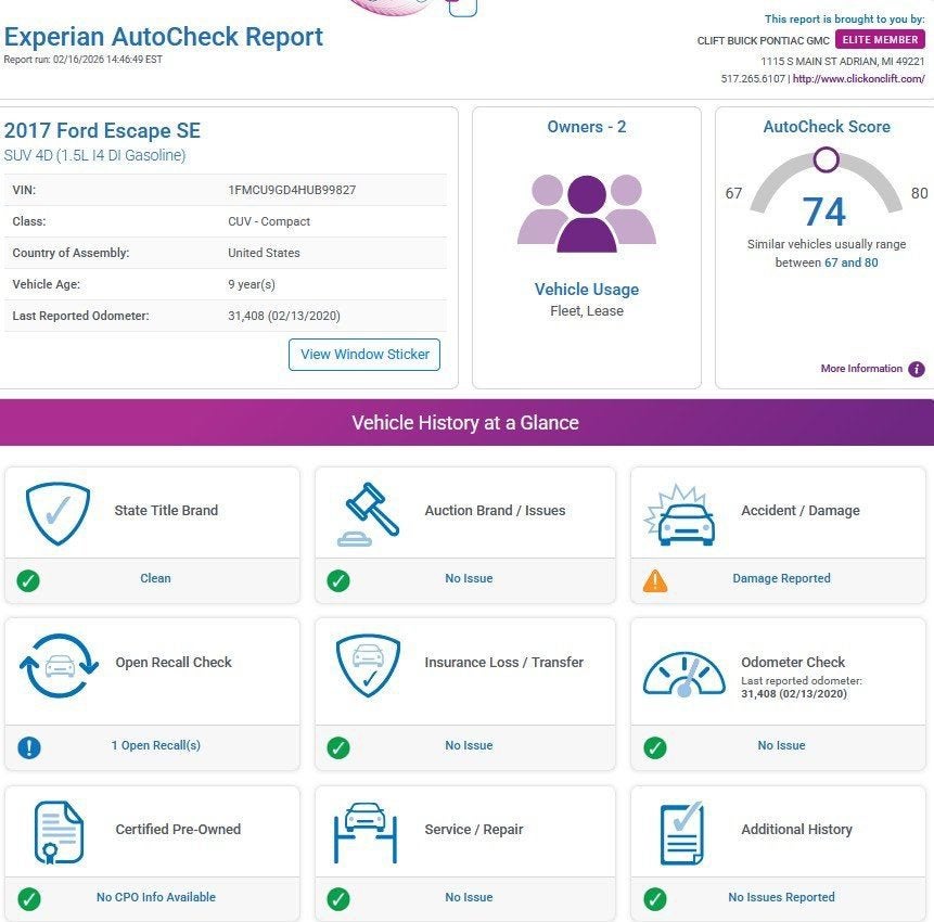 Recent Arrival! 2017 Escape Ford SE Lightning Blue Metallic*30-Day/1,000-Mile Limited Warranty* Alloy Wheels, Aluminum Wheels, Backup Camera, Bluetooth®, 4X4, 4WD, 110V/150W AC Power Outlet, 9 Speakers, AM/FM radio: SiriusXM, Automatic temperature control, Black Roof-Rack Side Rails, BLIS w/Cross Traffic Alert, CD player, Exterior Parking Camera Rear, Front dual zone A/C, Front fog lights, Fully automatic headlights, Halogen Projector Headlamps, One-Touch-Up/Down Front & Rear Windows, Reverse Sensing System, SE Technology Package, SYNC 3 Communications & Entertainment System, SYNC Connect, Unique Cloth Buckets w/60/40 Split Rear Seat, Wheels: 17 Sparkle Silver Painted Aluminum.Odometer is 14267 miles below market average! 22/28 City/Highway MPGAt Clift, all of our Vehicles Undergo Reconditioning to Make Sure that You are Getting a Quality Vehicle that You Deserve. This Includes Oil Change, Wash, Detail, and More. - You can Now Shop 24/7 Right from Your Home with Shop Click Drive. Pick up your Vehicle, Create your Deal, and Schedule your Delivery - Low Credit, Bad Credit, or No Credit to Buy a Vehicle? At Clift we Believe Everyone Deserves to purchase a vehicle, so We Offer Guaranteed Financing for Everyone. - We are a One Price Dealer! This means that we Keep our Prices as Low as Possible to Compete with other Dealerships. At Clift, you will find the Lowest Prices Possible. - We offer Free Delivery of your Newly Purchased Vehicle up to 25 Miles from our Dealership in Adrian, Michigan!Awards:* 2017 KBB.com 10 Best Used Compact SUVs Under $15,000 * 2017 KBB.com 10 Best SUVs Under $25,000 * 2017 KBB.com 10 Most Awarded Brands * 2017 KBB.com Brand Image Awards