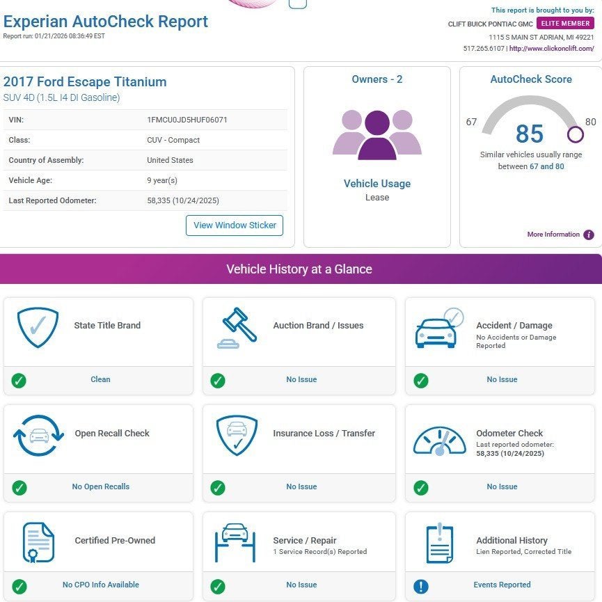 Recent Arrival! 2017 Escape Ford Titanium Ruby Red*30-Day/1,000-Mile Limited Warranty* Alloy Wheels, Aluminum Wheels, Backup Camera, Bluetooth®, Leather Seats, Moonroof, Navigation System, Remote Start, Sunroof/Moonroof, HEATED SEATS, POWER LIFTGATE, ACCIDENT FREE, AM/FM radio: SiriusXM, Auto-dimming Rear-View mirror, Automatic temperature control, Exterior Parking Camera Rear, Front dual zone A/C, Front fog lights, Fully automatic headlights, Garage door transmitter, Heated door mirrors, Heated Leather-Trimmed Buckets w/60/40 Rear Seat, Memory seat, Panoramic Vista Roof, Power door mirrors, Power driver seat, Power Liftgate, Radio: AM/FM Single CD/MP3, Rear Parking Sensors, SYNC 3 Communications & Entertainment System, Wheels: 18 Sparkle Silver-Painted Aluminum.Priced below KBB Fair Purchase Price! Odometer is 23862 miles below market average! 23/30 City/Highway MPGAt Clift, all of our Vehicles Undergo Reconditioning to Make Sure that You are Getting a Quality Vehicle that You Deserve. This Includes Oil Change, Wash, Detail, and More. - You can Now Shop 24/7 Right from Your Home with Shop Click Drive. Pick up your Vehicle, Create your Deal, and Schedule your Delivery - Low Credit, Bad Credit, or No Credit to Buy a Vehicle? At Clift we Believe Everyone Deserves to purchase a vehicle, so We Offer Guaranteed Financing for Everyone. - We are a One Price Dealer! This means that we Keep our Prices as Low as Possible to Compete with other Dealerships. At Clift, you will find the Lowest Prices Possible. - We offer Free Delivery of your Newly Purchased Vehicle up to 25 Miles from our Dealership in Adrian, Michigan!Awards:* 2017 KBB.com 10 Best Used Compact SUVs Under $15,000 * 2017 KBB.com 10 Best SUVs Under $25,000 * 2017 KBB.com 10 Most Awarded Brands * 2017 KBB.com Brand Image Awards
