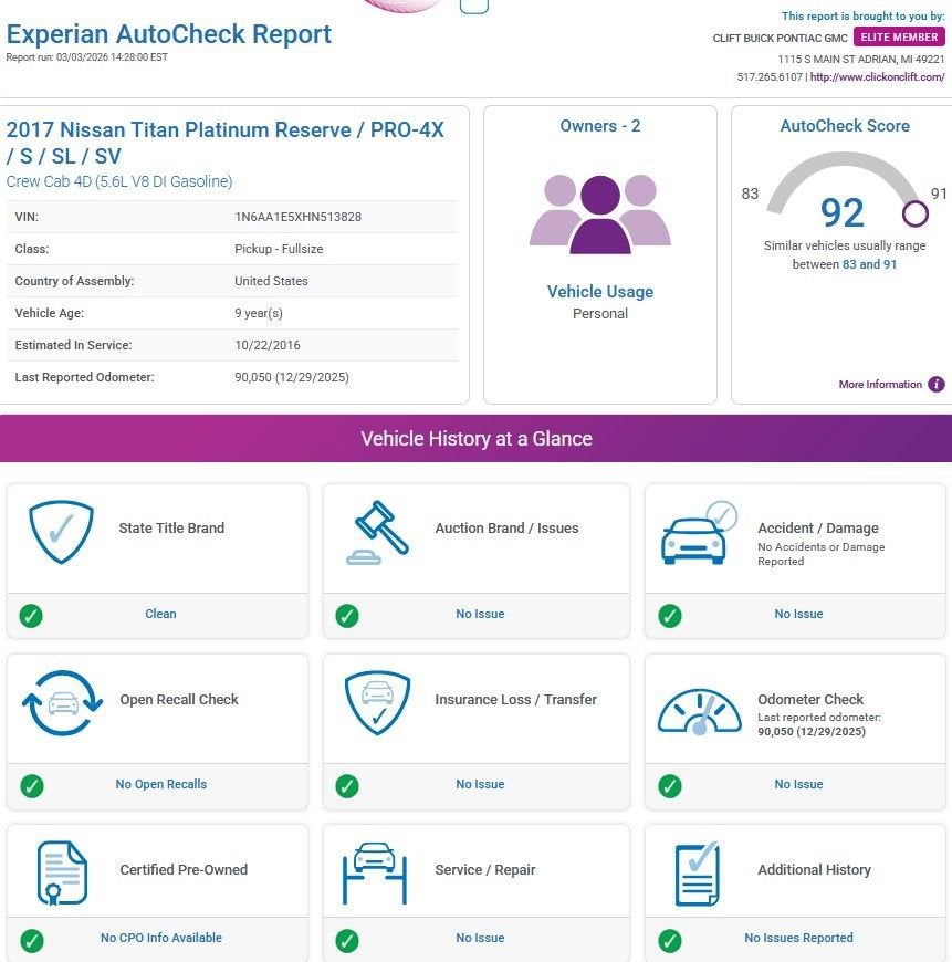 Recent Arrival! 2017 Titan Nissan Platinum Reserve Black*30-Day/1,000-Mile Limited Warranty* Alloy Wheels, Aluminum Wheels, Backup Camera, Bluetooth®, Leather Seats, Navigation System, 4X4, HEATED SEATS, VENTED SEATS, 4WD, 12 Speakers, 2.937 Axle Ratio, ABS brakes, Alloy wheels, AM/FM radio: SiriusXM, Auto tilt-away steering wheel, Auto-dimming door mirrors, Auto-dimming Rear-View mirror, Automatic temperature control, Blind Spot Warning, CD player, Compass, Electronic Stability Control, Front dual zone A/C, Front fog lights, Garage door transmitter: HomeLink, Heated & Cooled Front Captain's Chairs, Heated door mirrors, Heated front seats, Heated rear seats, Heated steering wheel, Illuminated entry, Low tire pressure warning, Memory seat, Navigation System, Power driver seat, Premium Leather Seat Trim, Radio: NissanConnect w/SiriusXM/Navi & Mobile Apps, Remote keyless entry, Traction control.At Clift, all of our Vehicles Undergo Reconditioning to Make Sure that You are Getting a Quality Vehicle that You Deserve. This Includes Oil Change, Wash, Detail, and More. - You can Now Shop 24/7 Right from Your Home with Shop Click Drive. Pick up your Vehicle, Create your Deal, and Schedule your Delivery - Low Credit, Bad Credit, or No Credit to Buy a Vehicle? At Clift we Believe Everyone Deserves to purchase a vehicle, so We Offer Guaranteed Financing for Everyone. - We are a One Price Dealer! This means that we Keep our Prices as Low as Possible to Compete with other Dealerships. At Clift, you will find the Lowest Prices Possible. - We offer Free Delivery of your Newly Purchased Vehicle up to 25 Miles from our Dealership in Adrian, Michigan!