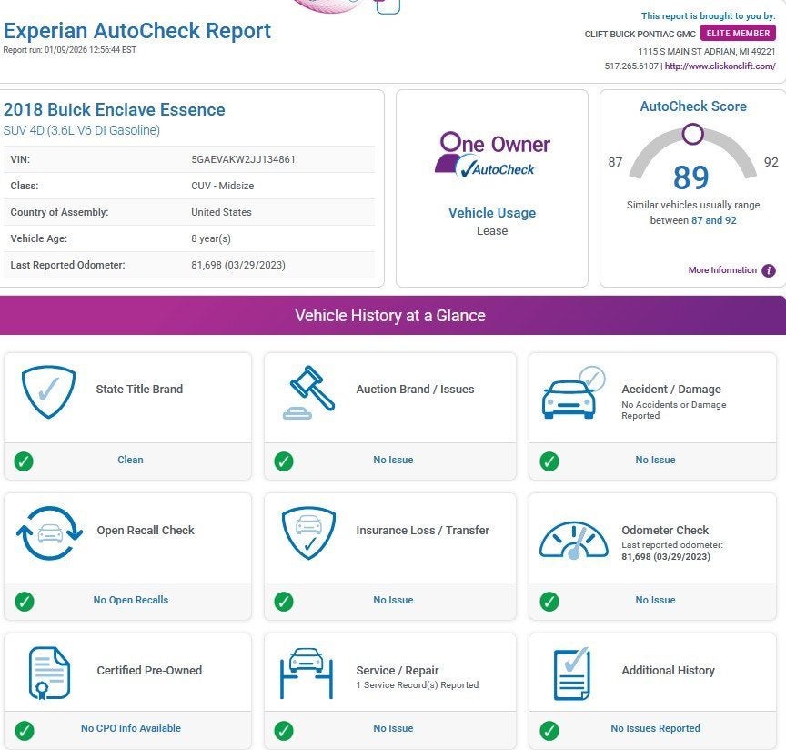 At Clift, all of our Vehicles Undergo Reconditioning to Make Sure that You are Getting a Quality Vehicle that You Deserve. This Includes Oil Change, Wash, Detail, and More. - You can Now Shop 24/7 Right from Your Home with Shop Click Drive. Pick up your Vehicle, Create your Deal, and Schedule your Delivery - Low Credit, Bad Credit, or No Credit to Buy a Vehicle? At Clift we Believe Everyone Deserves to purchase a vehicle, so We Offer Guaranteed Financing for Everyone. - We are a One Price Dealer! This means that we Keep our Prices as Low as Possible to Compete with other Dealerships. At Clift, you will find the Lowest Prices Possible. - We offer Free Delivery of your Newly Purchased Vehicle up to 25 Miles from our Dealership in Adrian, Michigan!