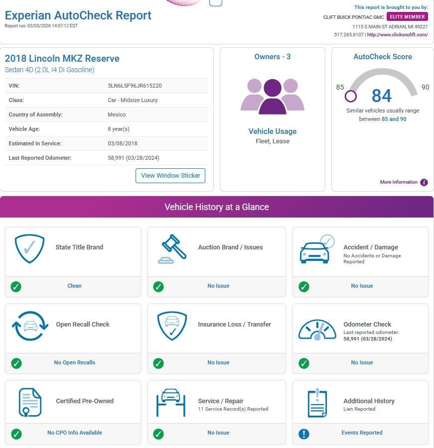 Recent Arrival! 2018 MKZ Lincoln Reserve Diamond*30-Day/1,000-Mile Limited Warranty* Alloy Wheels, Aluminum Wheels, Backup Camera, Bluetooth®, Leather Seats, Moonroof, Navigation System, Remote Start, Sunroof/Moonroof, HEATED SEATS, VENTED SEATS, AWD, Adaptive suspension, AM/FM radio: SiriusXM, AppLink/Apple CarPlay and Android Auto, Auto tilt-away steering wheel, Auto-dimming door mirrors, Auto-dimming Rear-View mirror, Automatic temperature control, Climate Package, Equipment Group 300A, Exterior Parking Camera Rear, Front dual zone A/C, Fully automatic headlights, Garage door transmitter, Heated door mirrors, Heated front seats, Heated Rear-Seats, Heated Steering Wheel, High-Intensity Discharge Headlights, Memory seat, Navigation System, Power driver seat, Power Moonroof, Radio: Revel Audio System, Rain Sensing Wipers, Rear Parking Sensors, SYNC 3, Ventilated front seats, Wheels: 19 Magnetic Painted 20 Spoke Aluminum, Windshield Wiper De-Icer.20/28 City/Highway MPGAt Clift, all of our Vehicles Undergo Reconditioning to Make Sure that You are Getting a Quality Vehicle that You Deserve. This Includes Oil Change, Wash, Detail, and More. - You can Now Shop 24/7 Right from Your Home with Shop Click Drive. Pick up your Vehicle, Create your Deal, and Schedule your Delivery - Low Credit, Bad Credit, or No Credit to Buy a Vehicle? At Clift we Believe Everyone Deserves to purchase a vehicle, so We Offer Guaranteed Financing for Everyone. - We are a One Price Dealer! This means that we Keep our Prices as Low as Possible to Compete with other Dealerships. At Clift, you will find the Lowest Prices Possible. - We offer Free Delivery of your Newly Purchased Vehicle up to 25 Miles from our Dealership in Adrian, Michigan!