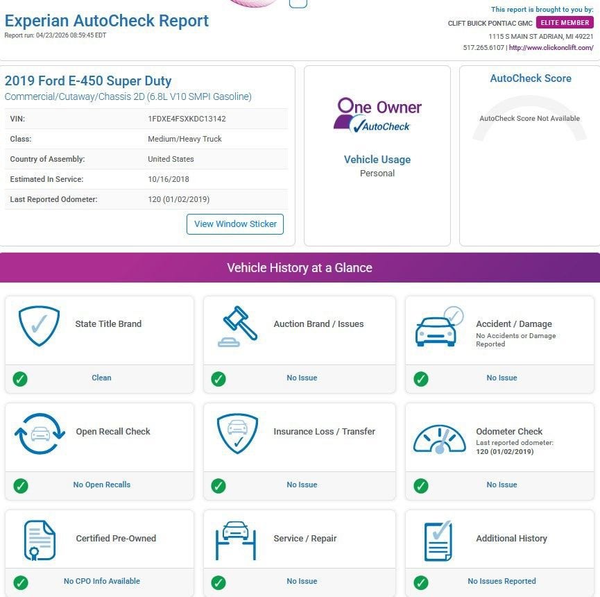 Recent Arrival! 2019 E-450SD Ford Oxford White*30-Day/1,000-Mile Limited Warranty* Alloy Wheels, Aluminum Wheels, Backup Camera, ACCIDENT FREE, 4.56 Axle Ratio w/Limited-Slip, Air Conditioning, Auxiliary Fuel Port, Chrome Grille, Cruise Control, Dual High Back Buckets, Electronic AM/FM Stereo w/Digital Clock, Front Chrome Bumper w/Black Lower Fascia, GVWR: 14,500 lb Payload Package, High Series Exterior Upgrade Package, Order Code 782A, Power Windows & Locks Group, Remote Keyless Entry.Odometer is 30803 miles below market average!At Clift, all of our Vehicles Undergo Reconditioning to Make Sure that You are Getting a Quality Vehicle that You Deserve. This Includes Oil Change, Wash, Detail, and More. - You can Now Shop 24/7 Right from Your Home with Shop Click Drive. Pick up your Vehicle, Create your Deal, and Schedule your Delivery - Low Credit, Bad Credit, or No Credit to Buy a Vehicle? At Clift we Believe Everyone Deserves to purchase a vehicle, so We Offer Guaranteed Financing for Everyone. - We are a One Price Dealer! This means that we Keep our Prices as Low as Possible to Compete with other Dealerships. At Clift, you will find the Lowest Prices Possible. - We offer Free Delivery of your Newly Purchased Vehicle up to 25 Miles from our Dealership in Adrian, Michigan!