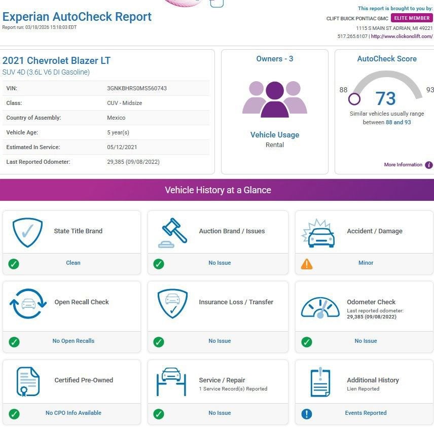 Recent Arrival! 2021 Blazer Chevrolet LT Cherry Red*30-Day/1,000-Mile Limited Warranty* Alloy Wheels, Aluminum Wheels, Backup Camera, Bluetooth®, Remote Start, V6, AWD, HEATED SEATS, AWD, 6-Speaker Audio System Feature, Apple CarPlay/Android Auto, Auto High-beam Headlights, Automatic temperature control, Black Roof Rails, Convenience & Driver Confidence Package, Exterior Parking Camera Rear, Front dual zone A/C, Fully automatic headlights, Heated door mirrors, Heated Driver & Front Passenger Seats, High-Intensity Discharge Headlights, Inside Rear-View Auto-Dimming Mirror, Lane Change Alert w/Side Blind Zone Alert, Outside Heated Power-Adjustable Body-Color Mirrors, Power driver seat, Preferred Equipment Group 2LT, Radio: Chevrolet Infotainment 3 System, Rear Cross Traffic Alert, Rear Park Assist w/Audible Warning, Rear Power Programmable Liftgate, Remote Start, SiriusXM Radio, Universal Home Remote, Wheels: 18 Bright Silver Aluminum.19/26 City/Highway MPGAt Clift, all of our Vehicles Undergo Reconditioning to Make Sure that You are Getting a Quality Vehicle that You Deserve. This Includes Oil Change, Wash, Detail, and More. - You can Now Shop 24/7 Right from Your Home with Shop Click Drive. Pick up your Vehicle, Create your Deal, and Schedule your Delivery - Low Credit, Bad Credit, or No Credit to Buy a Vehicle? At Clift we Believe Everyone Deserves to purchase a vehicle, so We Offer Guaranteed Financing for Everyone. - We are a One Price Dealer! This means that we Keep our Prices as Low as Possible to Compete with other Dealerships. At Clift, you will find the Lowest Prices Possible. - We offer Free Delivery of your Newly Purchased Vehicle up to 25 Miles from our Dealership in Adrian, Michigan!Awards:* JD Power Automotive Performance, Execution and Layout (APEAL) Study