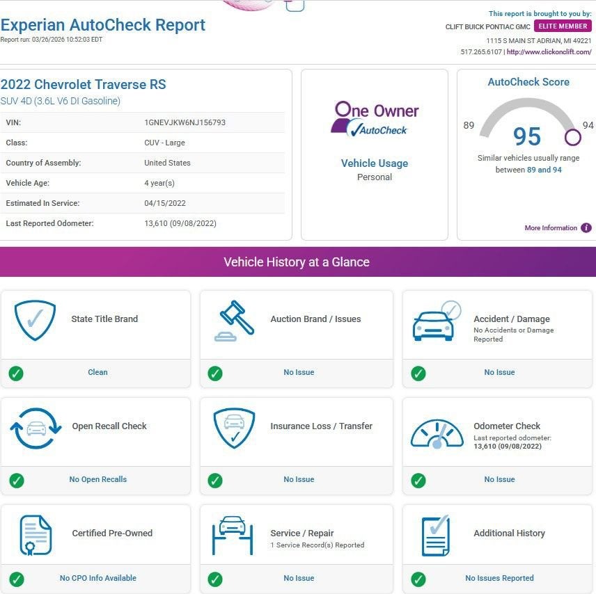 Recent Arrival! 2022 Traverse Chevrolet RS Silver Ice Metallic*30-Day/1,000-Mile Limited Warranty* Alloy Wheels, Aluminum Wheels, Backup Camera, Bluetooth®, Bose High End Sound Package, Leather Seats, Navigation System, Remote Start, AWD, HEATED SEATS, ONLY ONE PREVIOUS OWNER, POWER LIFTGATE, ACCIDENT FREE, AWD, 3rd row seats: split-bench, 6-Way Power Front Passenger Seat, 8-Way Power Driver Seat Adjuster, AM/FM radio: SiriusXM with 360L, Apple CarPlay/Android Auto, Auto High-beam Headlights, Auto-dimming Rear-View mirror, Automatic temperature control, Bose Premium 10-Speaker Audio System Feature, Front dual zone A/C, Fully automatic headlights, Garage door transmitter, Heated door mirrors, Heated Driver & Front Passenger Seats, Heated Steering Wheel, Heavy-Duty Cooling System, Hitch Guidance w/Hitch View, Leather steering wheel, Navigation System, Perforated Leather-Appointed Seat Trim, Power Liftgate, Preferred Equipment Group 2LT, Radio: Chevrolet Infotainment 3 Plus System w/Navi, Rear air conditioning, Rear Park Assist w/Audible Warning, Remote keyless entry, Trailering Assist Guidelines, Trailering Equipment, Wheels: 20 Dark Aluminum.At Clift, all of our Vehicles Undergo Reconditioning to Make Sure that You are Getting a Quality Vehicle that You Deserve. This Includes Oil Change, Wash, Detail, and More. - You can Now Shop 24/7 Right from Your Home with Shop Click Drive. Pick up your Vehicle, Create your Deal, and Schedule your Delivery - Low Credit, Bad Credit, or No Credit to Buy a Vehicle? At Clift we Believe Everyone Deserves to purchase a vehicle, so We Offer Guaranteed Financing for Everyone. - We are a One Price Dealer! This means that we Keep our Prices as Low as Possible to Compete with other Dealerships. At Clift, you will find the Lowest Prices Possible. - We offer Free Delivery of your Newly Purchased Vehicle up to 25 Miles from our Dealership in Adrian, Michigan!