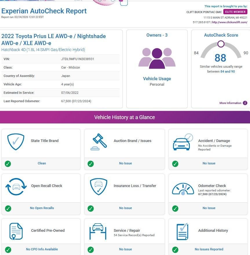 Recent Arrival! 2022 Prius Toyota XLE AWD-e Silver*30-Day/1,000-Mile Limited Warranty* Alloy Wheels, Aluminum Wheels, Backup Camera, Bluetooth®, AWD, HEATED SEATS, ACCIDENT FREE, 1.8L 4-Cylinder DOHC 16V VVT-i, ABS brakes, Active Cruise Control, Alloy wheels, AM/FM radio: SiriusXM, Apple CarPlay/Android Auto, Auto High-beam Headlights, Auto-dimming Rear-View mirror, Automatic temperature control, Electronic Stability Control, Exterior Parking Camera Rear, Front fog lights, Fully automatic headlights, Garage door transmitter, Heated door mirrors, Heated Front Bucket Seats, Heated steering wheel, Illuminated entry, Low tire pressure warning, Radio: Audio Plus, Remote keyless entry, Traction control.51/47 City/Highway MPGAt Clift, all of our Vehicles Undergo Reconditioning to Make Sure that You are Getting a Quality Vehicle that You Deserve. This Includes Oil Change, Wash, Detail, and More. - You can Now Shop 24/7 Right from Your Home with Shop Click Drive. Pick up your Vehicle, Create your Deal, and Schedule your Delivery - Low Credit, Bad Credit, or No Credit to Buy a Vehicle? At Clift we Believe Everyone Deserves to purchase a vehicle, so We Offer Guaranteed Financing for Everyone. - We are a One Price Dealer! This means that we Keep our Prices as Low as Possible to Compete with other Dealerships. At Clift, you will find the Lowest Prices Possible. - We offer Free Delivery of your Newly Purchased Vehicle up to 25 Miles from our Dealership in Adrian, Michigan!