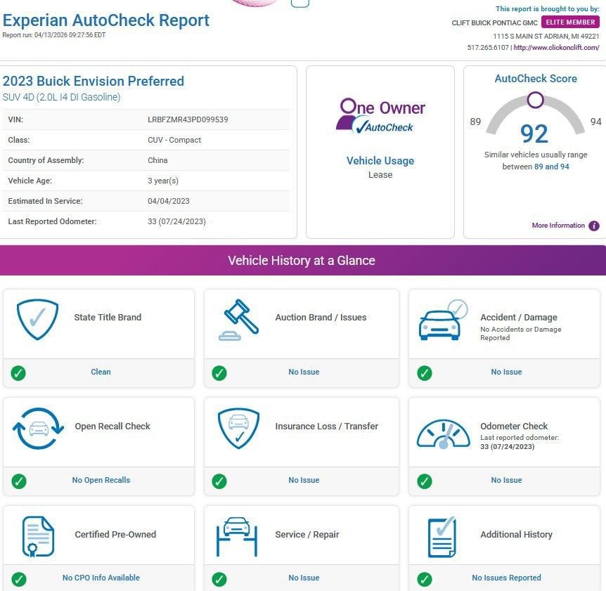 Recent Arrival! 2023 Envision Buick Preferred Moonstone Gray Metallic*30-Day/1,000-Mile Limited Warranty* Alloy Wheels, Aluminum Wheels, Backup Camera, Bluetooth®, Remote Start, AWD, HEATED SEATS, ONLY ONE PREVIOUS OWNER, ACCIDENT FREE, 7-Speaker Audio System Feature w/Amplifier, 8-Way Power Driver Seat Adjuster, Apple CarPlay/Android Auto, Auto High-beam Headlights, Auto-dimming door mirrors, Auto-dimming Rear-View mirror, Automatic Emergency Braking, Automatic temperature control, Cloth w/Leatherette Seat Trim, Following Distance Indicator, Forward Collision Alert, Front Bin Center Console USB Ports, Front dual zone A/C, Front Passenger 6-Way Manual Seat Adjuster, Fully automatic headlights, Heated door mirrors, Heated front seats, Heated steering wheel, IntelliBeam Headlamp Control w/Auto High Beam, Lane Keep Assist w/Lane Departure Warning, Power Liftgate, Premium audio system: Buick Infotainment System, Radio: Buick Infotainment System AM/FM Stereo, SiriusXM Radio, USB Charging-Only Ports, Wheels: 18 Aluminum w/Light Charcoal Met Finish, Wireless Apple CarPlay/Wireless Android Auto.Odometer is 14031 miles below market average! 22/29 City/Highway MPGAt Clift, all of our Vehicles Undergo Reconditioning to Make Sure that You are Getting a Quality Vehicle that You Deserve. This Includes Oil Change, Wash, Detail, and More. - You can Now Shop 24/7 Right from Your Home with Shop Click Drive. Pick up your Vehicle, Create your Deal, and Schedule your Delivery - Low Credit, Bad Credit, or No Credit to Buy a Vehicle? At Clift we Believe Everyone Deserves to purchase a vehicle, so We Offer Guaranteed Financing for Everyone. - We are a One Price Dealer! This means that we Keep our Prices as Low as Possible to Compete with other Dealerships. At Clift, you will find the Lowest Prices Possible. - We offer Free Delivery of your Newly Purchased Vehicle up to 25 Miles from our Dealership in Adrian, Michigan!