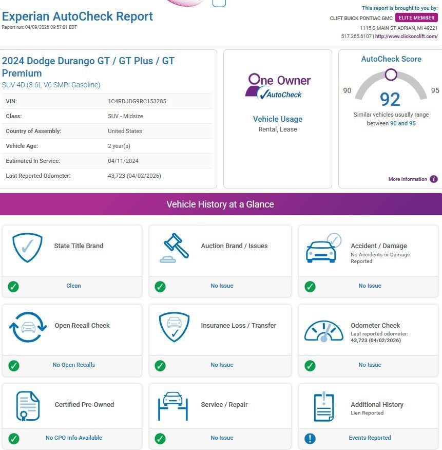 Recent Arrival! 2024 Durango Dodge GT Plus DB Black Crystal Clearcoat*30-Day/1,000-Mile Limited Warranty* Alloy Wheels, Aluminum Wheels, Backup Camera, Bluetooth®, Leather Seats, Moonroof, Navigation System, Remote Start, Sunroof/Moonroof, AWD, HEATED SEATS, VENTED SEATS, 3RD ROW, ONLY ONE PREVIOUS OWNER, POWER LIFTGATE, ACCIDENT FREE, AWD, 10.1 Touchscreen Display, 115V Auxiliary Power Outlet, 180 Amp Alternator, 3.45 Rear Axle Ratio, 3rd row seats: split-bench, 4G LTE Wi-Fi Hot Spot, 7 & 4 Pin Wiring Harness, Adaptive Cruise Control w/Stop, AM/FM radio: SiriusXM, Apple CarPlay, Auto-Dimming Exterior Driver Mirror, Automatic temperature control, Black Roof Rails, Blind Spot w/Trailer Detection, Class IV Receiver Hitch, Connected Travel & Traffic Services, Disassociated Touchscreen Display, Dual Remote USB Port - Charge Only, Exterior Mirrors w/Heating Element, Exterior Mirrors w/Memory, Exterior Mirrors w/Supplemental Signals, Floor Console w/Leather Armrest, Front dual zone A/C, Full Speed Forward Collision Warning Plus, Fully automatic headlights, Global Telematics Box Module (TBM), Gloss Black Exterior Mirrors, Google Android Auto, GPS Antenna Input, GPS Navigation, HD Radio, Heated front seats, Heated Second Row Seats, Heavy-Duty Engine Cooling, Integrated Center Stack Radio, Integrated Roof Rail Crossbars, Integrated Voice Command w/Bluetooth®, Leather Trimmed Bucket Seats, Leather Wrapped Door Panels, LED Auxiliary Low Beam & Turn Signal, ParkView Rear Back-Up Camera, Power 6x9 Multi-Function Foldaway Mirrors, Power 8-Way Driver Memory 8-Way Passenger Seats, Power Driver/Passenger 4-Way Lumbar Adjust, Power Liftgate, Power Sunroof, Power Tilt & Telescopic Steering Column, Quick Order Package 2BG GT Plus, Radio: Uconnect 5 Nav w/10.1 Display, Radio/Driver Seat/Mirrors Memory, Rear air conditioning, Rear Load Leveling Suspension, Red Accent Stitching, Trailer Brake Control, USB Host Flip, Ventilated Front Seats, Wheels: 20 x 8.0 Fine Silver.Odometer is 11814 miles below market average!At Clift, all of our Vehicles Undergo Reconditioning to Make Sure that You are Getting a Quality Vehicle that You Deserve. This Includes Oil Change, Wash, Detail, and More. - You can Now Shop 24/7 Right from Your Home with Shop Click Drive. Pick up your Vehicle, Create your Deal, and Schedule your Delivery - Low Credit, Bad Credit, or No Credit to Buy a Vehicle? At Clift we Believe Everyone Deserves to purchase a vehicle, so We Offer Guaranteed Financing for Everyone. - We are a One Price Dealer! This means that we Keep our Prices as Low as Possible to Compete with other Dealerships. At Clift, you will find the Lowest Prices Possible. - We offer Free Delivery of your Newly Purchased Vehicle up to 25 Miles from our Dealership in Adrian, Michigan!